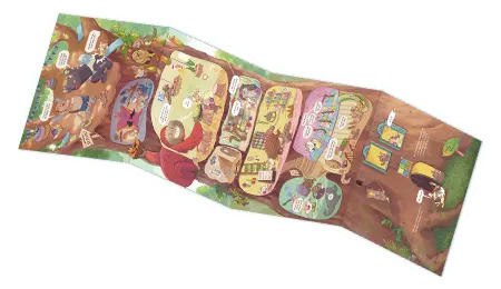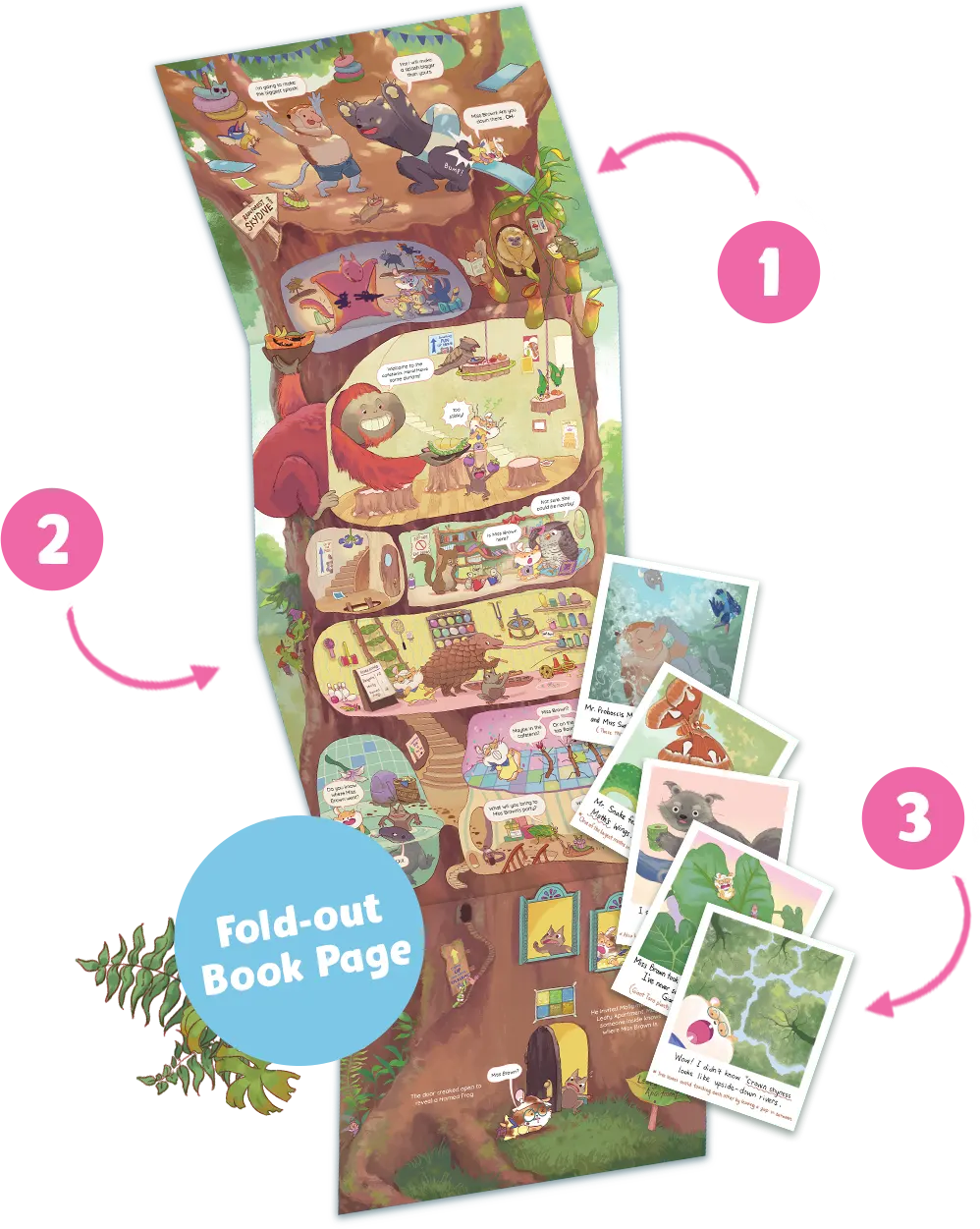 The book has a spectacular long spread reveals a bustling tree-trunk home where delightful animal characters showcase their unique habits in fun, creative illustrations.